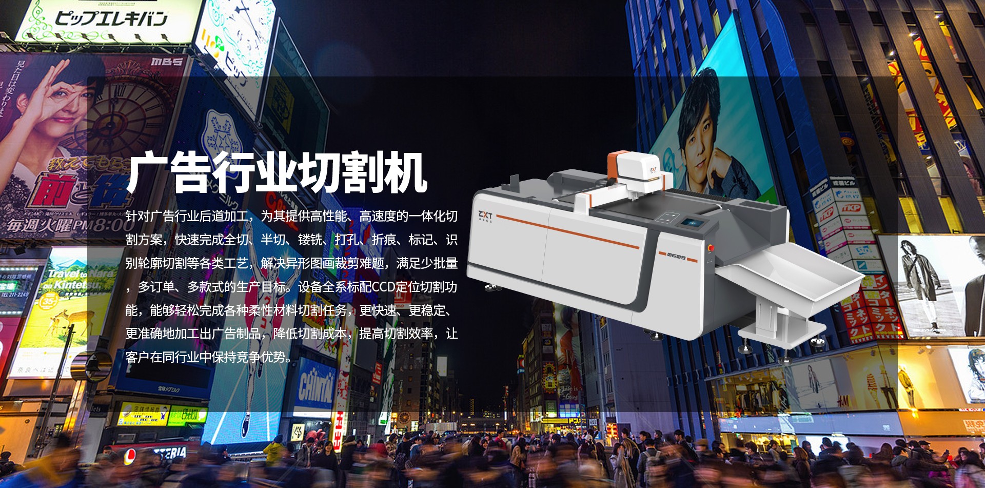 卓星廣告行業(yè)電腦切割機(jī)主要針對廣告行業(yè)后道加工,為其提供高性能、高速度的一體化切割方案,快速完成全切、半切、鏤銑、打孔、折痕、標(biāo)記、識別輪廓切割等各類工藝,解決異形圖畫裁剪難題,滿足少批量,多訂單、多款式的生產(chǎn)目標(biāo)。設(shè)備全系標(biāo)配CCD定位切割功能,能夠輕松完成各種柔性材料切割任務(wù),更快速、更穩(wěn)定、更準(zhǔn)確地加工出廣告制品,降低切割成本,提高切割效率,讓客戶在同行業(yè)中保持競爭優(yōu)勢。